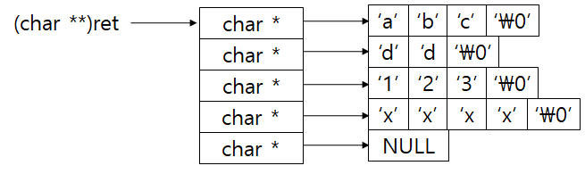 get_count + 1만큼 동적 할당한 결과. 현재 ret는 5개의 char *를 가리키고 있다. 이제 각 char *마다 다시 동적 할당을 해주어야 한다. ret[0] (첫 번째 char *)은 "abc"를 저장해야 하므로 4만큼 ret[1]은 "dd"를 저장해야 하므로 3만큼... 동적 할당을 해주어야 한다다. 이후 값을 복사해 ret를 반환하면 된다.